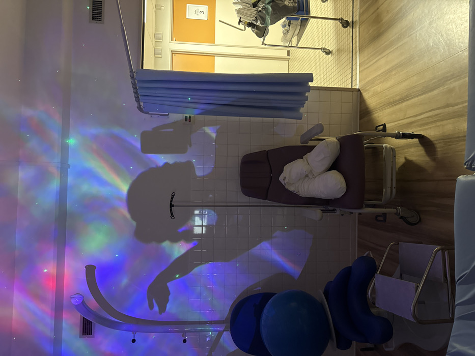 This image captures the interior of "Suite d'accouchement 3" (Birthing Suite 3) within a medical facility, located in Tourcoing, France. The scene is characterized by multi-colored light projections creating an aurora-like pattern with scattered star-like dots on a white tiled wall. A distinct human shadow, appearing to be an individual with hair tied up, is cast onto this illuminated wall, holding a smartphone as if taking a selfie. On the left, a white, curved metal apparatus resembling a birthing shower or water therapy unit is positioned next to a large blue birthing ball resting on a circular base. Below the ball are blue ergonomic support cushions and a small, light-colored stool with a metal frame. Centrally, a burgundy medical recliner chair on wheels, featuring white armrests, holds a large white, irregularly shaped support pillow. A metal IV stand with a black hook is situated near the chair. To the right, a light blue privacy curtain, suspended from a ceiling track, partially obstructs a view into an adjacent area. Beyond the curtain, a doorway leads to a space featuring two light brown doors, one clearly labeled "Suite d'accouchement 3." A silver, multi-shelved medical utility cart containing various supplies is visible in this area. The room features light brown wooden or laminate flooring.