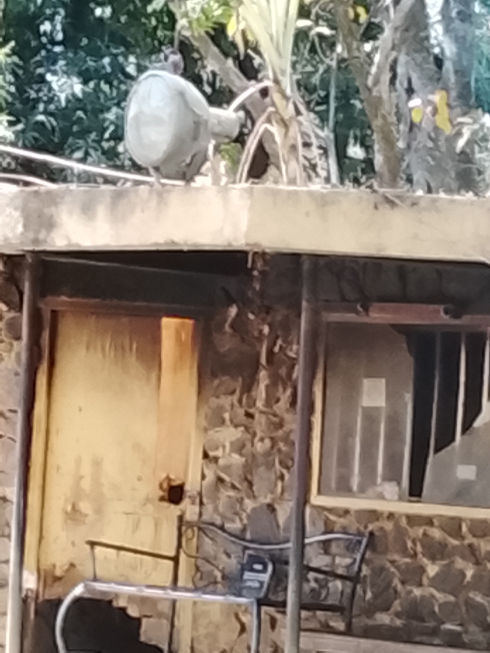 This image depicts the exterior of a building in Jos, Nigeria, observed during daylight. A light-colored, bulbous container, possibly a pot or water heater, is situated on a concrete ledge or roofline at the top of the structure. A small, dark bird is perched on this container. The building's facade is constructed from irregular, dark-toned stones or rocks. On the left, a weathered, light-brown wooden door is visible, framed by a vertical wooden beam. To the right of the door, a window with a light frame shows internal vertical bars and appears to have damaged or missing glass panes. Below the window, a dark, ornate metal bench is partially obscured by a light-colored metal railing in the immediate foreground. Dense green foliage and tree branches are visible in the background, above and behind the building.