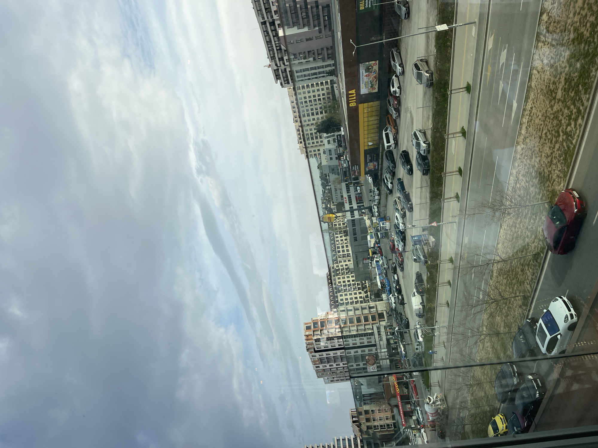 view from a high vantage point, likely a building window, overlooking a section of Sofia, Bulgaria. The sky is overcast with grey clouds. Buildings of varying heights and architectural styles dominate the cityscape. A prominent feature is a Billa supermarket situated along a busy street. A road runs parallel to the Billa supermarket, marked with directional arrows. Cars are parked and moving along the road. Several trees line the road. Reflections are present on the window the image was taken through.