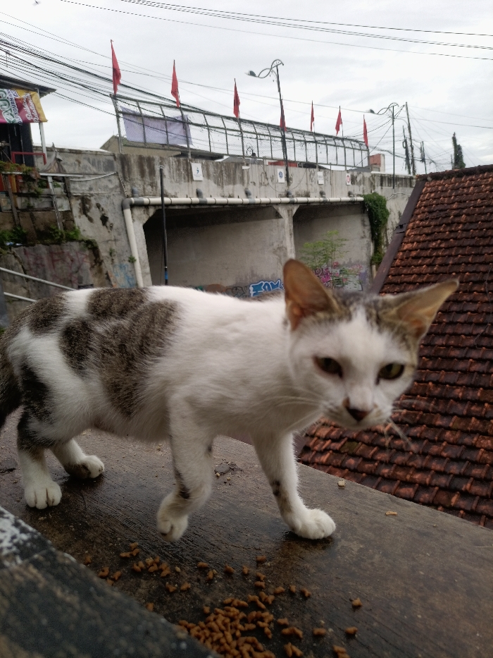 A white and gray tabby cat walks across a weathered surface with kibble scattered nearby. The cat's ears are perked, and its gaze is focused. Behind the cat, a tiled roof leads to an elevated concrete structure with metal fencing and red flags. Graffiti decorates the concrete, and utility lines crisscross the sky. The scene is overcast.