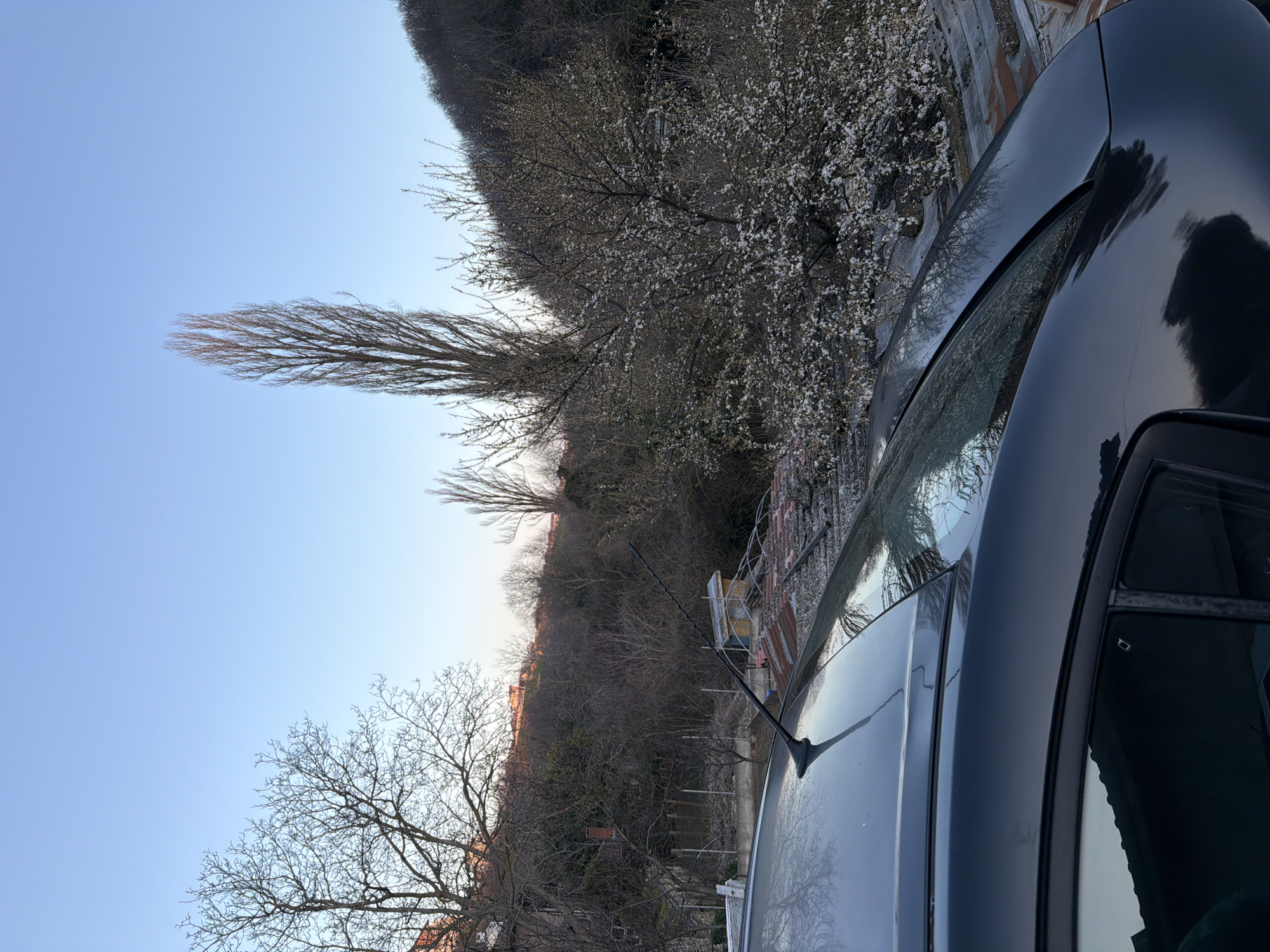 A panoramic outdoor image captured in Kavarna, Bulgaria, under a clear, light blue sky, indicating daylight conditions. The foreground prominently features the rear portion of a dark grey or black four-door vehicle (likely a sedan or hatchback), displaying its roof, rear windshield, and part of the trunk. A black whip antenna is affixed to the rear roof section. Reflective surfaces of the vehicle show distorted images of the sky and surrounding bare trees. Beyond the vehicle, a sloped terrain descends into a valley, densely populated by dormant deciduous trees. One prominent tree on the right side exhibits small white blossoms, indicating early spring. Within this midground, a small, light-colored wooden utility shed with a light blue pitched roof is visible. Adjoining it, a corrugated metal roof section is partially covered by a translucent arch-shaped structure, possibly a makeshift greenhouse. To the far right, a steep hill densely covered with bare trees forms a natural boundary. On the elevated left background, several residential-type structures with red tile roofs are discernible amongst the bare trees. No individuals or active interactions are depicted.