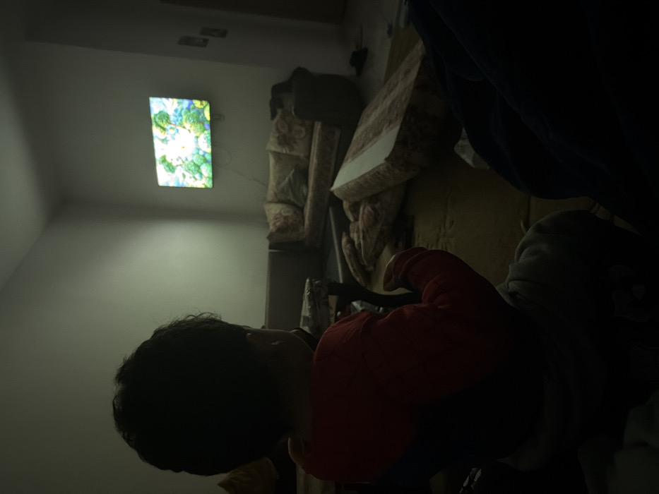 A child in a red and blue shirt sits in a dimly lit room, their dark hair visible against the light wall. The child faces a brightly lit, rectangular screen displaying abstract, colorful patterns. Behind the child, there's furniture covered in a patterned fabric. A dark blue or black garment hangs in the background. The room has minimal lighting except for the screen.