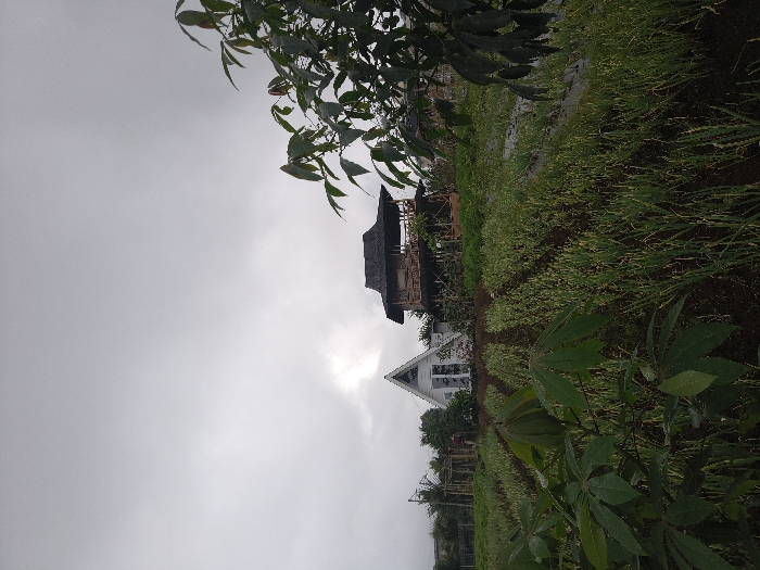 This image depicts an agricultural scene in An Khe Ward, Vietnam, under an overcast sky. In the foreground, rows of green, slender-leaved plants, consistent with scallions or similar alliums, are cultivated in dark soil, extending from the bottom center towards two structures in the midground. Several broad-leaved, dark green plants, possibly cassava, are prominent in the immediate lower left and center foreground, slightly obscuring the field. In the midground, situated on a gentle incline beyond the cultivated field, are two distinct buildings. To the left stands a white A-frame structure with a steeply pitched roof and large glass double doors/windows on its facade. To the right, a multi-tiered, open-air wooden structure with a dark, possibly thatched roof rises. This structure exhibits visible wooden beams and railings, suggesting a rustic construction style. The background is dominated by a uniformly grey, cloudy sky with a brighter patch of light visible towards the horizon. Lush green foliage and trees are visible behind and between the two structures, indicating a vegetated environment surrounding the cultivated area. No individuals or active interactions are visible.