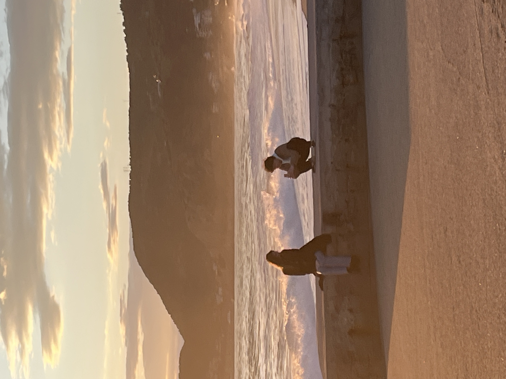 A vertical, eye-level shot captures a scene along the coastline of Alanya, Turkey, bathed in warm light. The sea occupies a significant portion of the image, displaying moderate waves gently approaching the shore. Two individuals are situated near the water's edge: one is crouched, seemingly interacting with the sea or something at the water's edge; the other is standing, appearing to observe the sea. A mountainous landscape, likely part of the Taurus Mountains, can be seen in the background, extending upwards toward a sky with scattered clouds. A paved pathway runs parallel to the shoreline. The color palette is dominated by natural earth tones and golden hues from the sun.