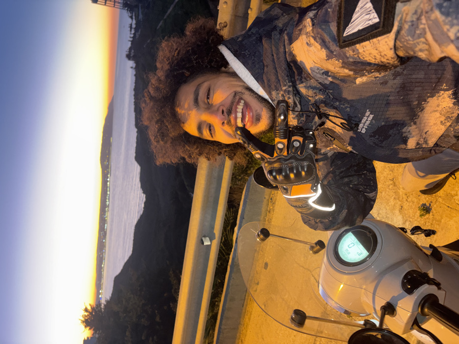 A man poses on a moped against a sunset backdrop over water. He wears a patterned jacket and gloves, flashing a peace sign. The moped is white with a transparent windscreen. The scene is illuminated by warm, golden light, possibly from streetlights, creating a serene and vibrant atmosphere. A guardrail is partially visible in the foreground.
