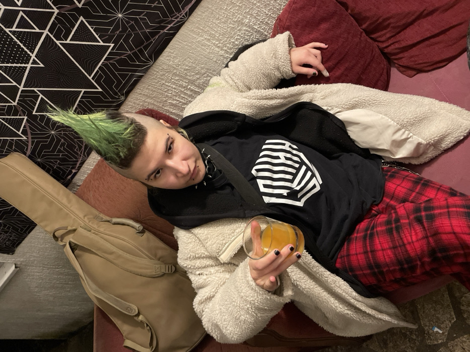 A person with a green mohawk lies on a couch with red plaid pants. They wear a black sweatshirt with a geometric design, a spiked collar, and a cream-colored fleece jacket. They hold a glass of orange juice. Beside them lies a tan guitar case. The couch has patterned and red cushions. The person looks at the camera with a slight tilt of their head.