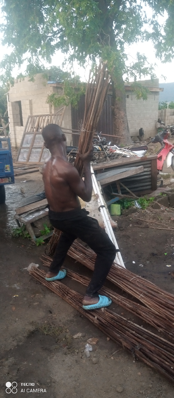 The image depicts an outdoor scene in the city of Adankolo, Nigeria, featuring a male engaged in manual labor. The individual, seen from the back, is shirtless with a visibly sweaty back, wearing dark pants and light blue slip-on sandals. He is carrying a substantial bundle of long, thin, brown, cylindrical objects, possibly wooden poles or rebar, which rests across his left shoulder and is secured by both hands. On the dirt ground in the foreground and beneath the subject, several similar bundles of these materials are laid horizontally. The ground itself is uneven, composed of damp dirt with scattered small plants and debris. The background reveals a makeshift area or construction site. To the left, a portion of a blue vehicle is visible. Directly behind the subject, there is an assortment of construction materials, including metal window or door frames, corrugated metal sheets, and wooden planks. A partially constructed building made of light-colored concrete blocks stands in the mid-background, with a large tree providing overhead foliage. To the right, parts of at least two motorcycles are discernible, one red and white, and another darker colored. A second, partially visible individual is present in the far right background near a motorcycle. A green plastic container is also visible on the ground in the mid-right.