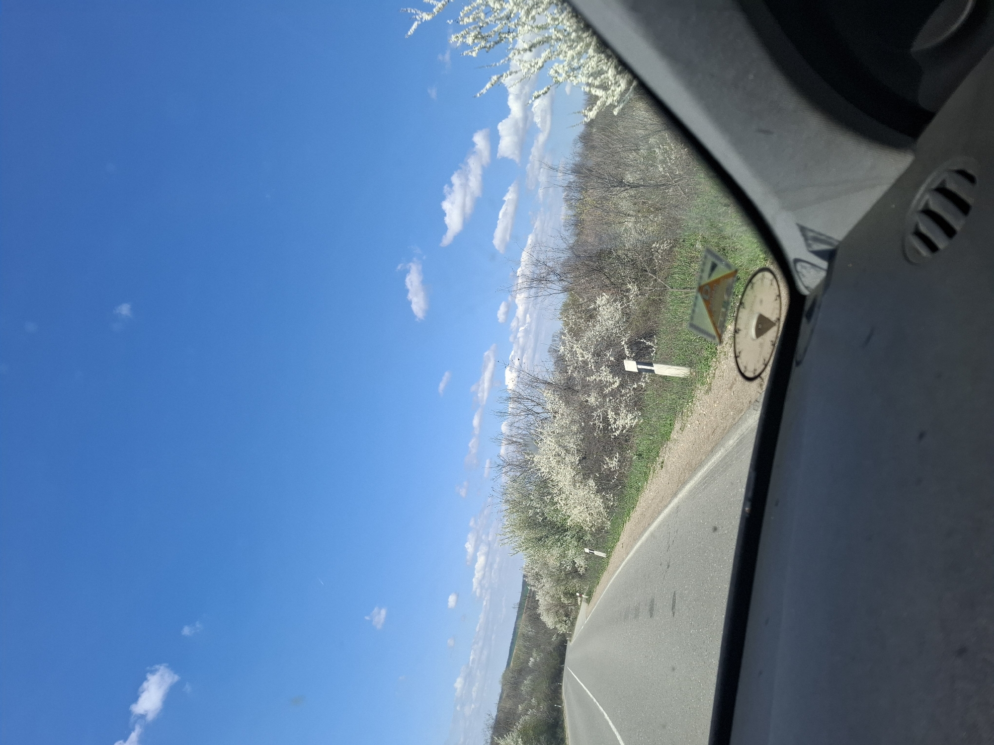 A view from inside a vehicle shows a road in Smirnenski, Bulgaria on a sunny day. White blooming trees line the road. A blue sky with scattered clouds is visible. The dashboard of the vehicle is visible in the foreground, including a sticker and air vent.