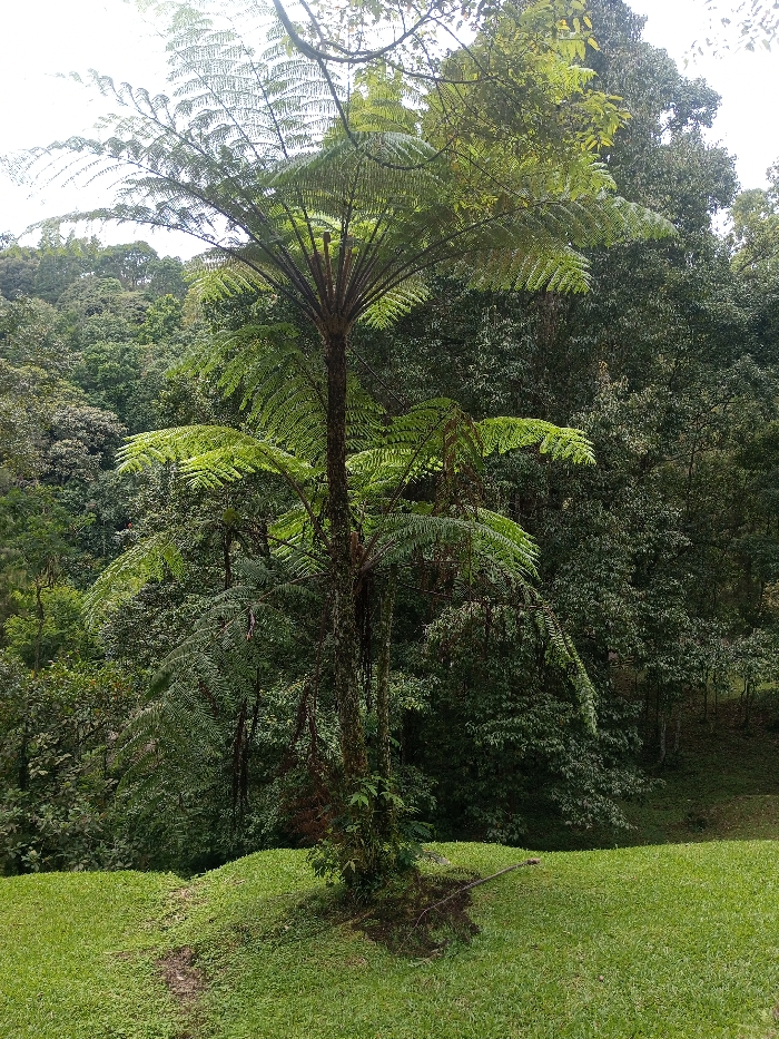 The scene displays a lush, verdant outdoor environment, reportedly located in the city of Kanand, India. A prominent tall tree fern, characterized by a dark, slender trunk partially covered in climbing vegetation, stands centrally in the midground. Its crown consists of numerous large, bright green, feathery fronds radiating outwards. Several smaller tree ferns or similar plants are visible around the base of the main tree and extend into the midground. The foreground consists of a meticulously maintained, light green grassy area with undulating terrain, featuring a subtle dirt path traversing its left side. In the background, a dense, dark green forest or jungle spans the horizon, comprising various types of trees with diverse foliage densities. The sky overhead is bright and appears overcast. A thin, dark, linear object rests horizontally on the grass immediately to the right of the main tree fern's base. No human figures, animals, or artificial structures are present within the frame.