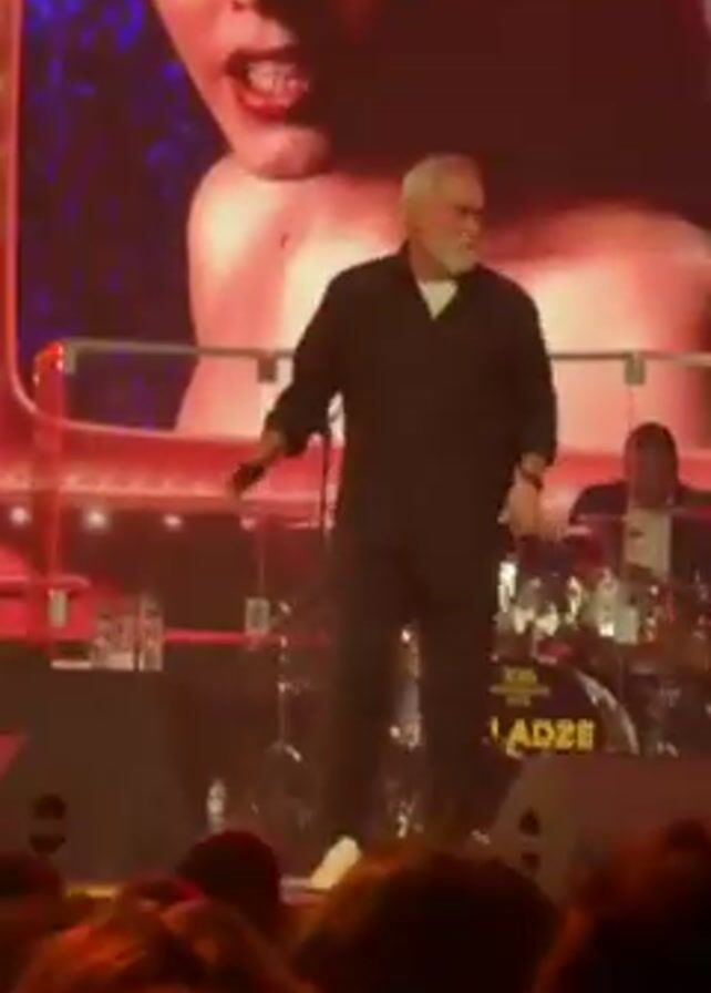A man with white hair and a beard is singing into a microphone on a stage. He is wearing a dark suit. Behind him is a large screen showing a woman's face. A drummer can be seen behind him. The stage is lit with red lights, and there is a crowd of people in front of the stage.