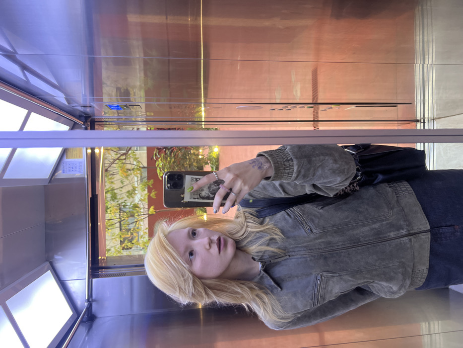 - "A light-skinned female individual with layered, bleached blonde hair is depicted taking a selfie inside an elevator" by FM-XTCFJ3, licensed under CC BY 4.0