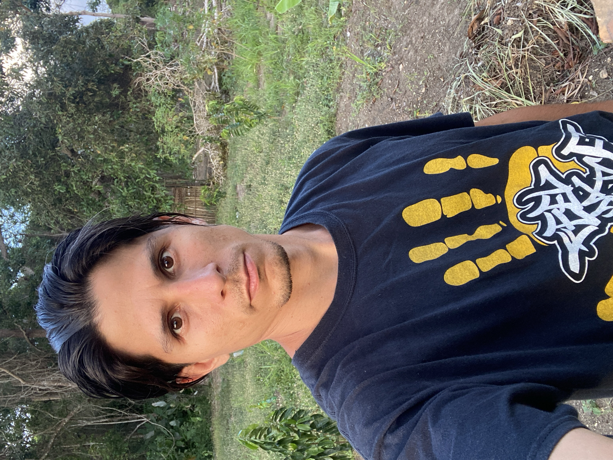 A medium shot captures a man outdoors. The background contains trees, grass, and vegetation. The location is likely Los Velásquez, Venezuela. The man wears a dark T-shirt with yellow handprint designs. His hair is dark and slicked back, his eyes are brown, and he has a light mustache. The image appears to be a selfie.