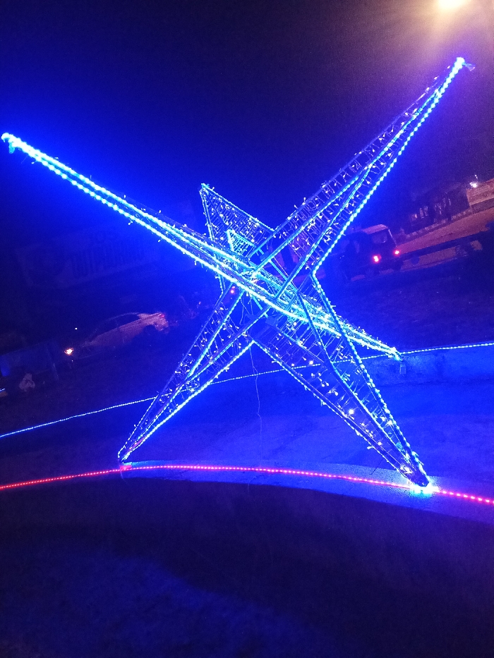 A large, illuminated star stands against a dark blue night sky. The star has a complex, geometric design with multiple points. It is lit with a combination of white and blue lights that emphasize its structure. Red lights are visible on the ground. A vehicle is visible in the background, illuminated by a streetlight. The lighting creates a bright focal point against the dark background, emphasizing the star's size and presence.