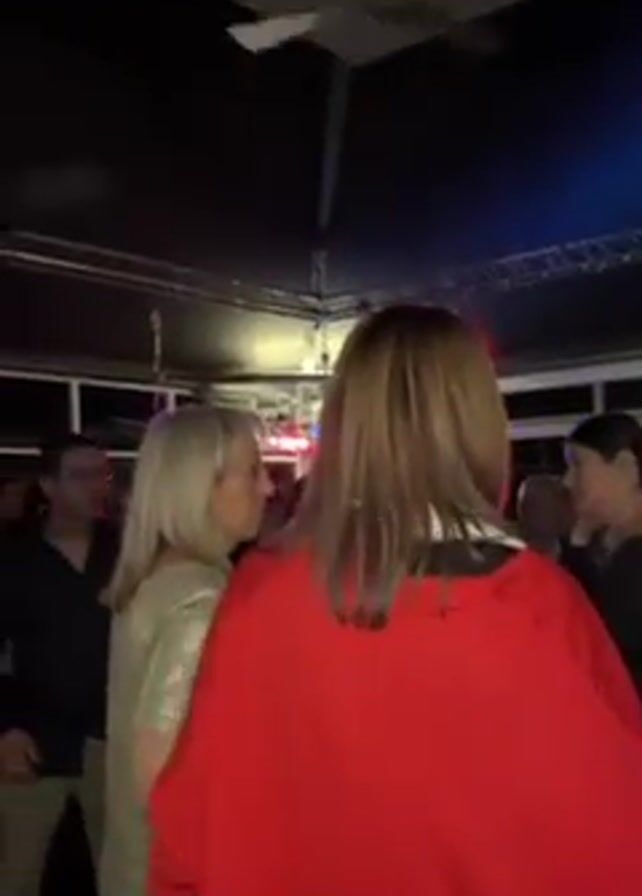 group of people at a party. They are standing and chatting, and some appear to be dancing, to the music that is playing. The room has a dark ceiling and large windows along one side. There is a ceiling fan and some kind of rigging hanging from the ceiling. The lighting is dark, with colorful spotlights and strobing lights adding to the atmosphere. The video is shaky and the perspective is from within the crowd.