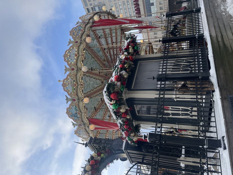 The image displays an ornate, multi-tiered carousel situated in Moscow, Russia, specifically near Red Square, as indicated by the partial "ГУМ" (GUM) sign visible on a background building. In the foreground, a black wrought-iron fence with decorative finials encloses a snowy area. To the left, a dark architectural structure, possibly an entrance arch, is heavily draped with garlands of red, green, and gold spherical ornaments, topped with a layer of snow. A dark-colored booth, likely a ticket kiosk, with white trim and windows, is similarly adorned with extensive garlands and snow covering its roof. The carousel's canopy is light blue and white, featuring intricate decorative patterns, and is illuminated by multiple white globe lights. The canopy's perimeter is embellished with decorative panels depicting scenic vistas and golden angel figures. Red fabric streamers are suspended from the carousel's internal framework. The ground is covered with a uniform layer of snow. The background features a blue sky with scattered white clouds and a tall, multi-story building. No individuals are visible.