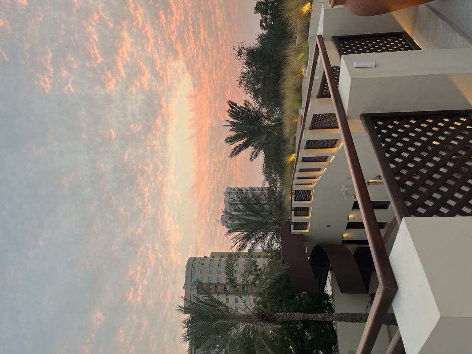 This image captures an urban landscape at sunset in Sharjah, United Arab Emirates. The upper two-thirds of the frame are dominated by a sky displaying altocumulus clouds, transitioning from light blue to vivid pink and orange hues, indicating either sunrise or sunset, with the warm colors suggesting sunset. In the midground, a multi-level architectural structure features cream-colored exterior walls and dark brown wooden elements. A prominent dark brown spiral staircase descends towards the left, partially obscured by a tall palm tree. The structure's balustrades are composed of solid cream sections topped with dark brown railings and interspersed with rectangular wooden lattice panels. Warm-toned lights are integrated into the architecture, illuminating walkways and the lattice work. Above this structure, an elevated green space or rooftop garden with grasses and smaller plants is visible, also dotted with small yellow accent lights. On the far right, a large, traditional-style terracotta urn rests on a raised cream platform. The background reveals several modern high-rise buildings, predominantly light-colored, with numerous windows. One building on the far left features a distinctive rounded corner. Numerous palm trees of varying heights, interspersed with other green foliage, are scattered throughout the background and midground, contrasting with the urban structures. No individuals are visible in the scene, and no actions or interactions are depicted. The scene is static. The architectural style, blending traditional elements like the lattice work with modern high-rises and abundant palm trees, is characteristic of urban developments in Sharjah, such as those found around the Heart of Sharjah or Al Majaz Waterfront areas.