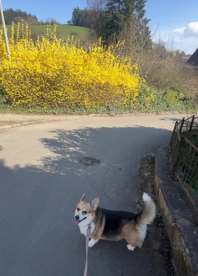 A low-angle perspective captures a sunny daytime scene of a person walking a Corgi on a leash down a narrow asphalt road in a rural setting. The Corgi, characterized by its short legs, tricolor fur, and upright ears, is on the left side of the road near a low stone wall topped with a metal fence. To the left, a vibrant yellow flowering bush adds a splash of color to the landscape. As the road ascends slightly, houses with red-tiled roofs become visible. A clear blue sky with scattered clouds serves as the backdrop. The camera is in motion, following the dog and capturing its movements.