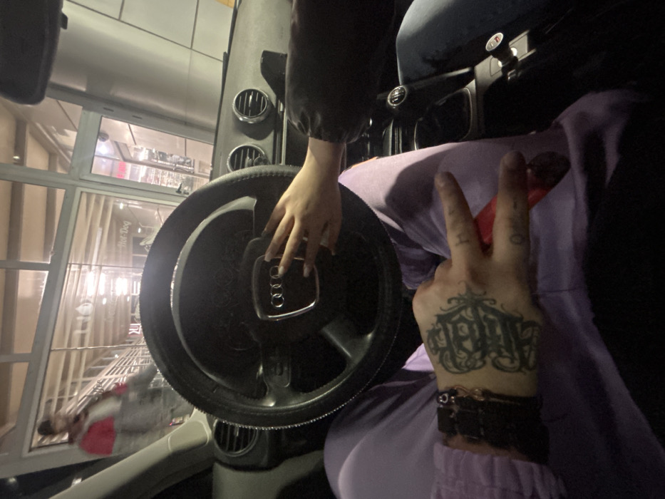 The scene is captured from inside the passenger compartment of an Audi vehicle at night, facing forward through the windshield. The dominant feature in the foreground is a black Audi steering wheel, bearing the Audi rings logo. A female's manicured hand, with light-colored nail polish, extends from the right side of the frame, resting gently on the Audi logo on the steering wheel. This hand is connected to an arm clad in a dark, long-sleeved garment. To the lower left, a male's left hand is visible, exhibiting extensive dark tattooing in a gothic script style across the back of the hand and fingers. This hand wears multiple dark-colored bracelets on the wrist and holds a small red object, possibly a lighter, between the index and middle fingers, forming a "V" or peace sign gesture. The person's lower body is clad in light purple trousers. Beyond the vehicle's windshield, a brightly lit commercial building with a large glass facade is visible. Inside the building, illuminated by artificial lighting, a blurred figure of an individual in a red and grey jacket and grey pants is seen walking or moving past the glass. Signage within the building includes the word "Hot-Dog." The building's interior suggests a retail establishment, such as a supermarket or a section of a shopping mall. The location is a commercial area within the city of Varna, Bulgaria, specifically a retail establishment or shopping center featuring a food stand, as indicated by the "Hot-Dog" sign visible through the glass facade.