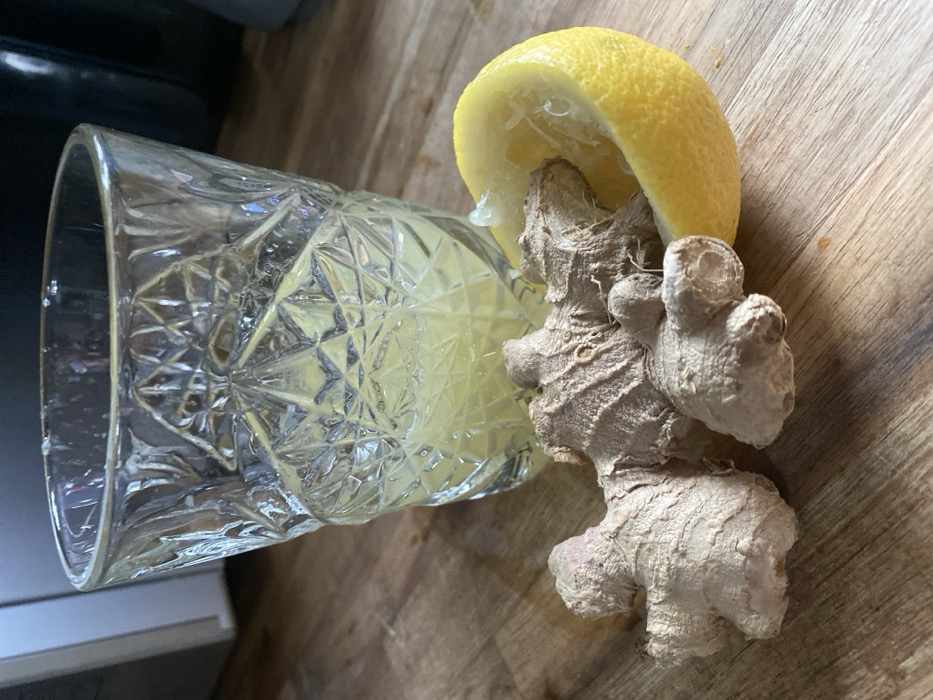 In a domestic setting within Wattrelos, France, a clear, faceted glass tumbler containing a pale yellow liquid is positioned centrally on a light brown wooden surface with visible grain. To the immediate left and slightly forward of the glass, two unpeeled ginger roots are present, exhibiting their characteristic knobby, light brown, and textured skin. Directly to the right of the ginger roots and partially overlapping one, a squeezed yellow lemon half lies on its side, displaying its bright rind and internal white pith. The background is out of focus, revealing a light-colored vertical surface to the upper left and a darker, indistinct object to the upper right. No individuals are present in the scene.