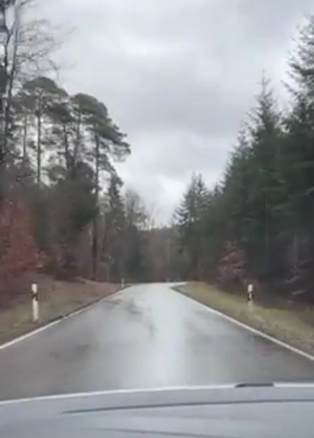 A first-person perspective video shows a car driving along a wet, narrow road winding through a forest. The sky is overcast. The trees are mostly bare, except for some evergreen trees. The road has white lines marking its edges. A hand is visible gripping the steering wheel. The rearview mirror is visible at the top of the frame.