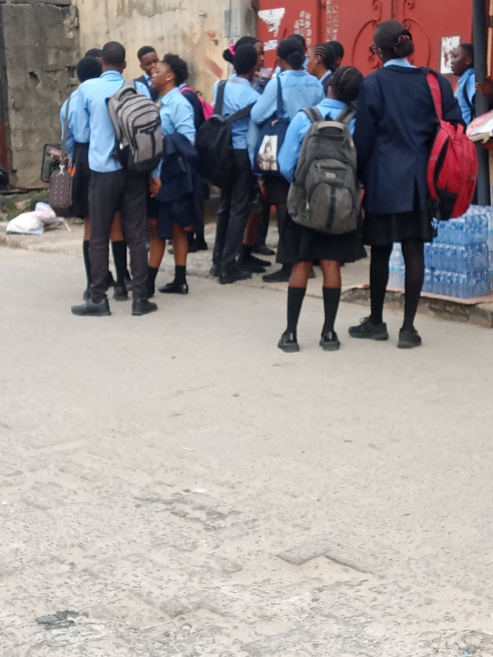 The image depicts approximately 15-20 adolescents, primarily students, standing on a light gray paved surface in an urban outdoor setting in Unknown, Unknown