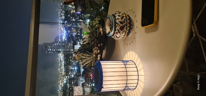 The image depicts a nighttime urban panorama from a high vantage point in Ramat Gan, Israel, viewed from a balcony or rooftop. In the foreground, a white, round outdoor table occupies the lower half of the frame. On the table, from left to right, are: a cylindrical lantern with a blue metal frame and white translucent panels, emitting a warm glow; a decorative black planter containing various green succulents and small white stones; and a colorful ceramic ashtray featuring blue, white, yellow, red, and green floral patterns. To the right, a smartphone with a yellow case rests face down on the table. Beyond the table, a clear glass barrier separates the foreground from the extensive city lights of Ramat Gan and surrounding areas visible in the background. The cityscape is illuminated by numerous streetlights and building lights, stretching into the hazy distance under a dark night sky. A tall, slender skyscraper, centrally located in the background, is prominently lit. No people or specific actions are visible in the scene.