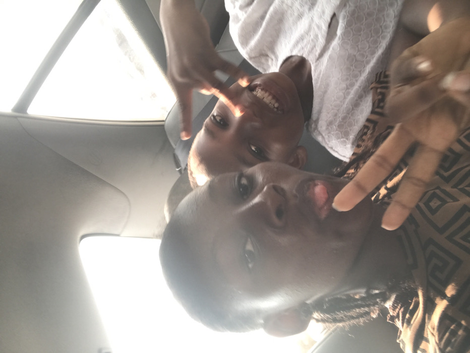 Two dark-skinned individuals are posing for a selfie in a car, possibly the back seat
