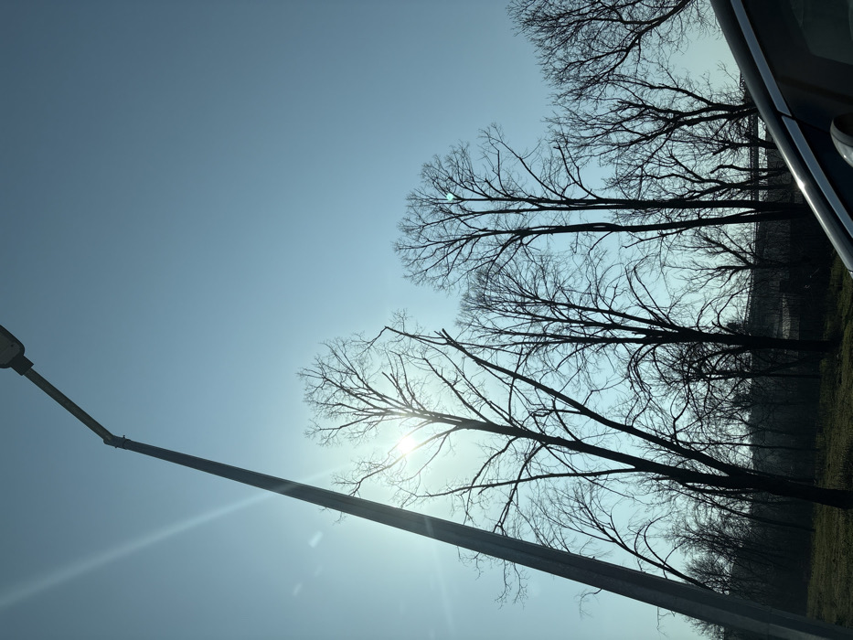 The image captures a bright, clear daytime scene in Knezha, Bulgaria, looking upwards towards a light blue sky. A tall, grey street light pole occupies the left side of the frame, extending diagonally from the lower-left to the upper-center. The sun, partially obscured by the pole in the upper-left, emits a strong flare and visible sunbeams. Silhouetted against the bright sky is a dense cluster of numerous deciduous trees with bare branches, indicative of late autumn or winter. These trees span the middle and lower sections of the image. In the distant background, through and above the lower tree line, faint dark structures and a long, horizontal elevated structure, possibly a bridge or overpass, are discernible. The upper-right corner of a dark-colored vehicle, including its roofline and window trim, is visible in the lower-right foreground, suggesting the photograph was taken from a vehicle. No individuals or specific activities are observable.