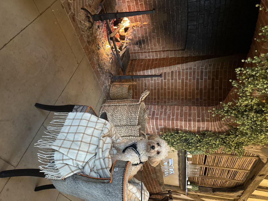 The image displays an interior scene in East Suffolk, United Kingdom, characterized by a rustic aesthetic. A large, active brick fireplace dominates the left side, containing burning wood logs on a black metal grate. A pair of black metal fireplace tools stands vertically to the right of the fire. Above the fireplace opening, dense green foliage, consistent with hops, drapes down and is interwoven with small, glowing lights. To the right of the fireplace, two woven straw baskets of differing sizes are placed on the light-colored stone slab floor. A small, light-colored, fluffy dog, wearing a dark harness with a leash attached, sits upright on an upholstered armchair positioned in the foreground to the right. The armchair is covered with a beige plaid blanket featuring brown lines and a fringe. The dog is looking directly forward. In the background on the right, architectural elements include exposed dark wooden beams and slatted wooden panels. A counter or shelf below these panels holds several clear glasses or goblets and a white decorative sign with the letters "DIA" visible. The overall lighting is warm, emanating primarily from the fire.