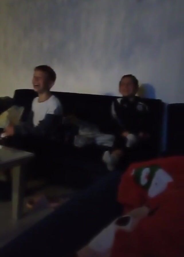 Two boys are sitting on a dark couch in a dimly lit room. The boy on the left is wearing a white shirt and appears to be laughing hard. The boy on the right is wearing a black and white outfit and is also smiling. A small table is to the left of the couch. In the foreground, there is a red blanket or sheet with a white pattern. Above them, there's a decorative light fixture on the wall. The environment is indoors, and the overall impression is of a cozy, casual setting.