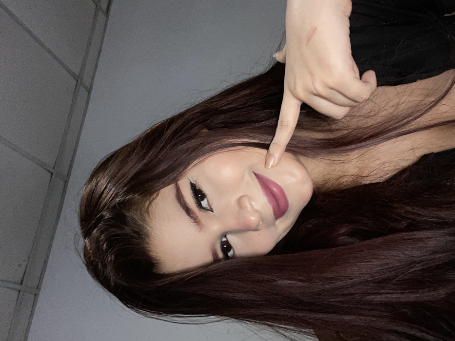 A young woman with long, dark brown hair smiles slightly, pointing at her cheek with a finger. She wears dark eyeliner and mauve lipstick. The background consists of a plain, off-white wall. The image is rotated, causing the woman to appear sideways. She has light skin and a focused gaze. The composition emphasizes her face and hair.