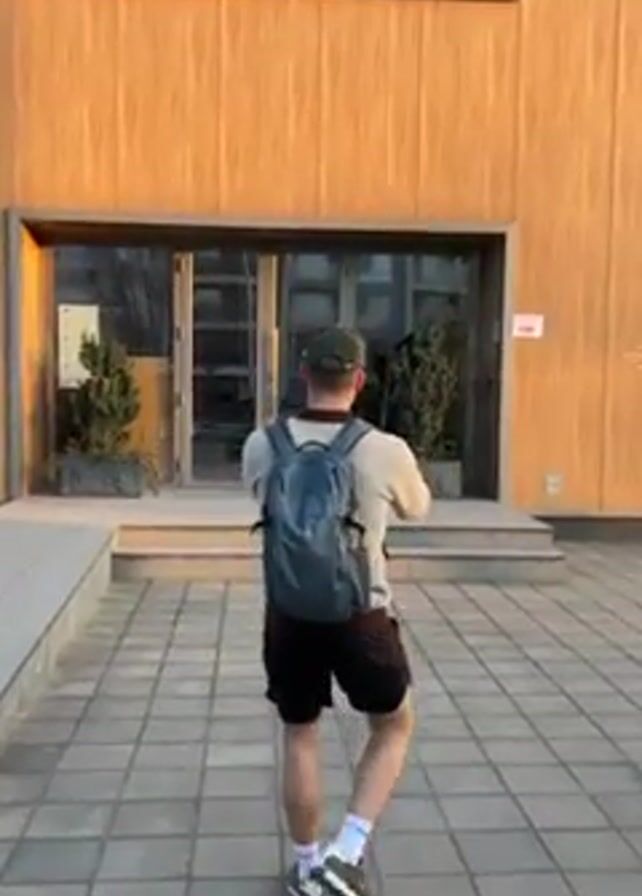 A man wearing a backpack, shorts, a light colored long-sleeved shirt, and a baseball cap walks toward the entrance of a fitness center on a sunny day. The center is called Vitality Gym and the sign is also written in Cyrillic. There is an additional sign that reads “Styler” above the gym’s sign. The building is light brown.