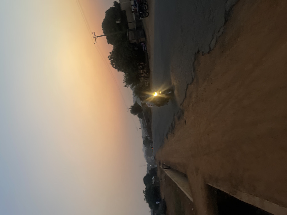 A street scene at dusk with a motorcycle driving on a road. The sky is a mix of blue and orange as the sun sets. Power lines run along the side of the street. The pavement is cracked and worn. Vegetation is on either side of the road. The image is taken from a high angle, looking down at the street.
