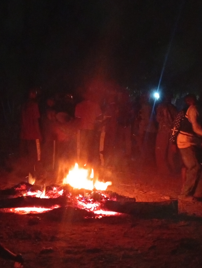 A nighttime gathering around a large bonfire