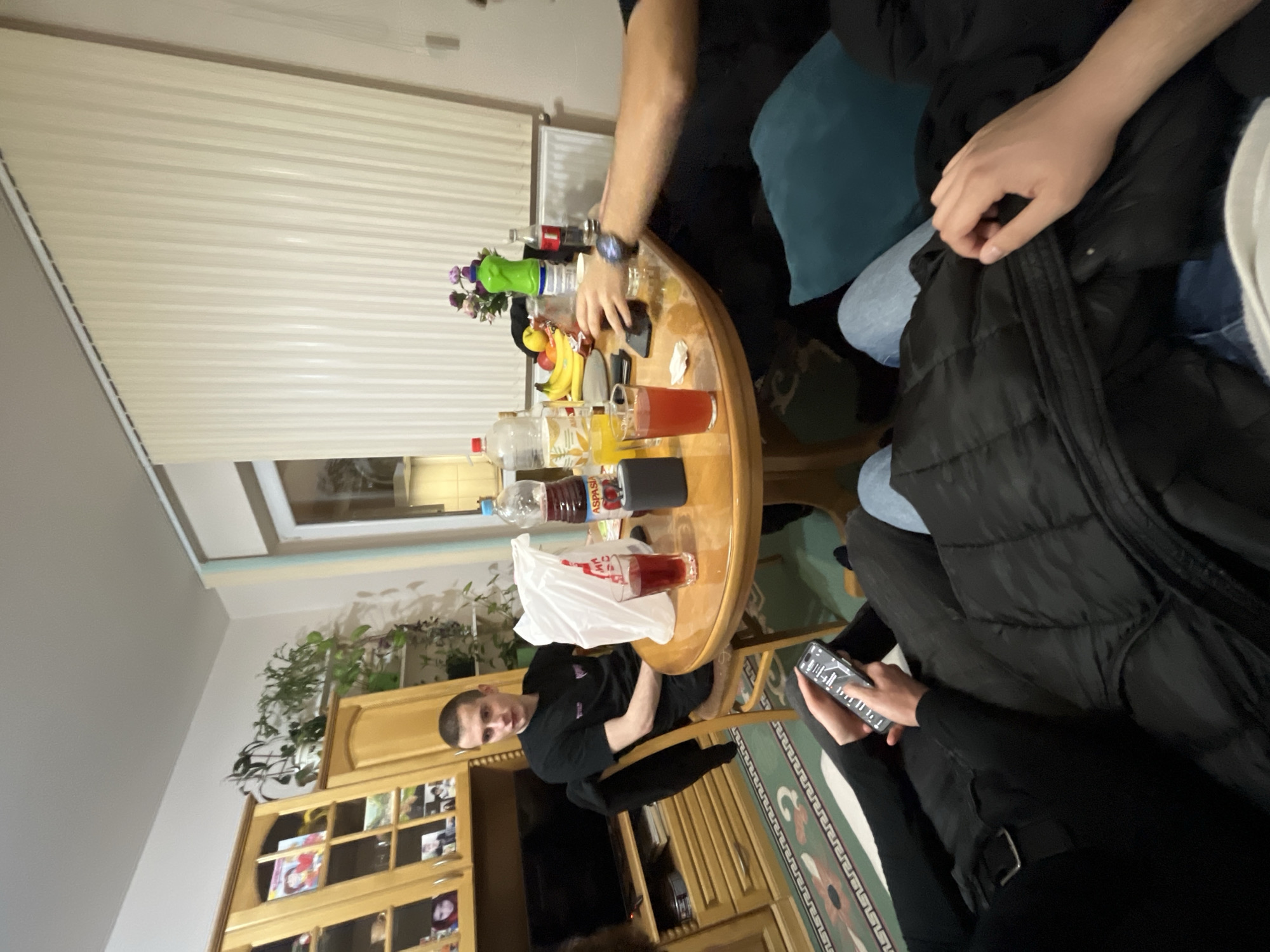 A group of individuals are gathered around a round wooden table laden with various objects including glasses filled with red and orange liquids, several bottles, fruit (bananas and grapes), and flowers. One individual is using a mobile phone. The scene takes place indoors, likely in a dining or living area. There's a wooden cabinet in the background with shelves containing books and decorative items, along with plants on top. Through a window, a white building appears to be visible. The location is in a home and, based on its architecture, this is Shumen, Bulgaria.