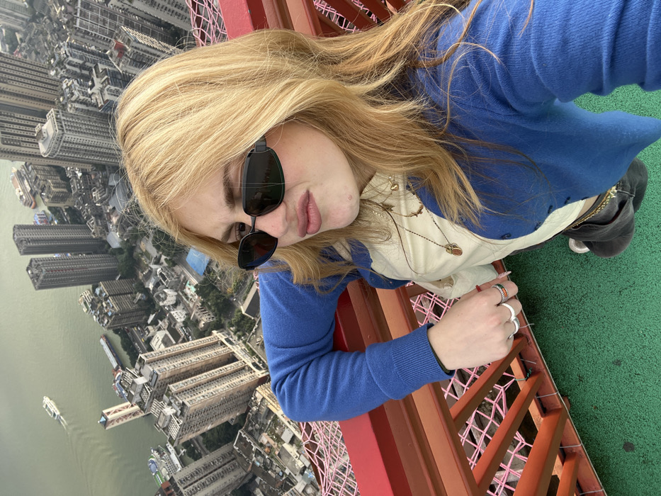 - "A blonde woman wearing sunglasses and a blue cardigan leans over a red railing with a cityscape in the background" by FM-VYYYD2, licensed under CC BY 4.0