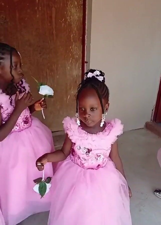 Three young girls, likely flower girls, wearing pink frilly dresses are standing in a line. The dresses have sequined bodices and pink ribbons tied in bows at the back. Each girl has braids in their hair styled with small decorative clips. They are holding white fabric roses. The girls are in front of a brown door and a neutral-colored wall. They look at each other and then away. The camera moves slightly around them.