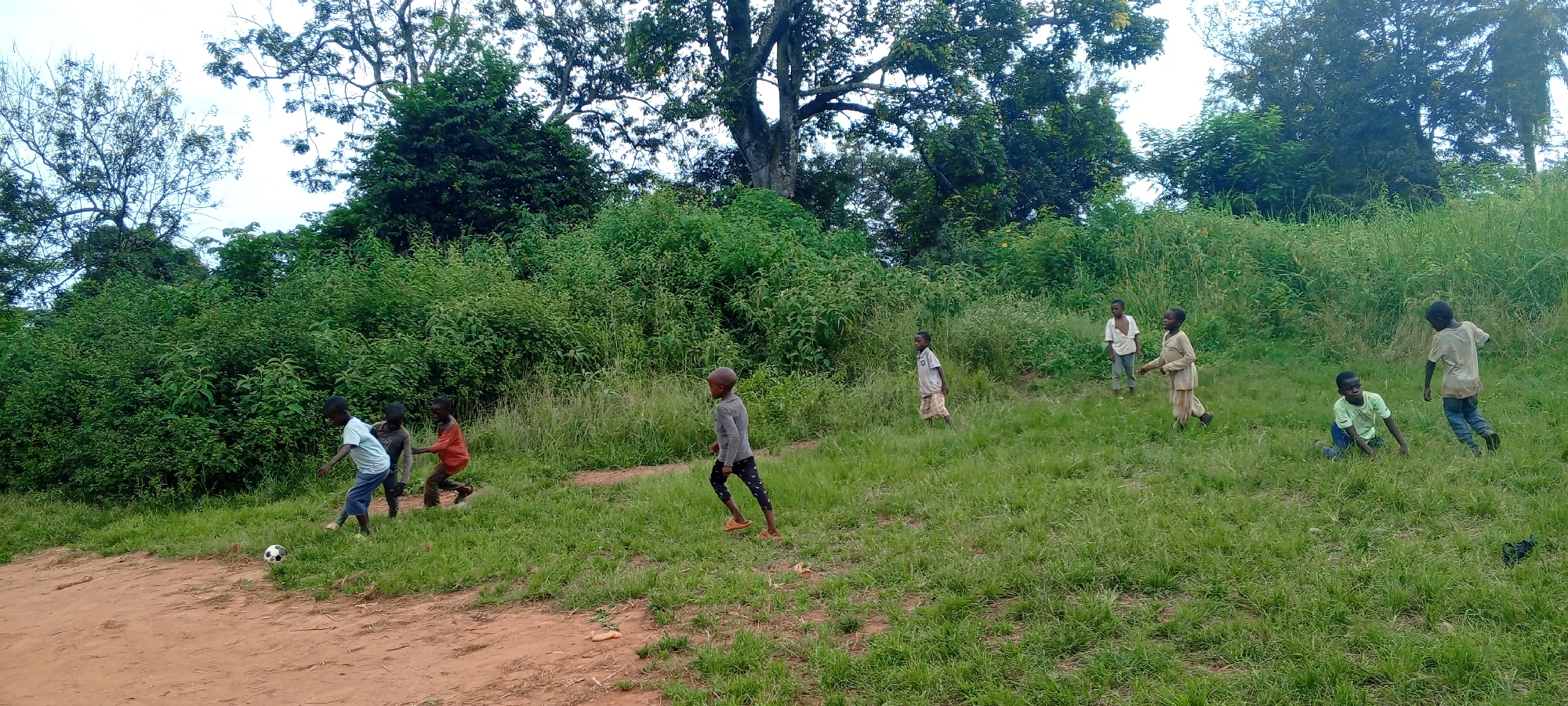 In Ngalula, Democratic Republic of the Congo, a group of children play in a grassy field. The field is bordered by dense green vegetation and trees. A dirt path runs along the edge of the field. One child kicks a soccer ball while two others run alongside. Several other children are dispersed across the field, some standing and others running. One child is on the ground. The children are wearing a variety of casual clothes.