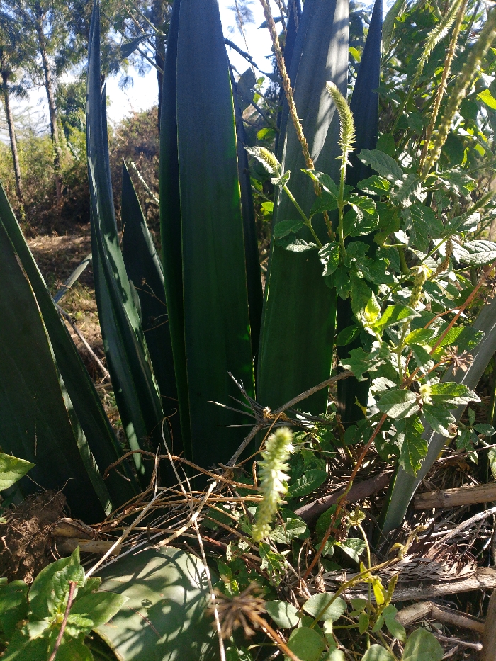 Tall, pointed, dark green leaves of a snake plant dominate the foreground. The leaves are surrounded by smaller, sprawling green plants with clusters of small leaves and spiky stalks. Dry twigs and fallen leaves are scattered at the base. A few trees are visible in the blurred background. The scene is bathed in sunlight, creating strong shadows and highlighting textures.