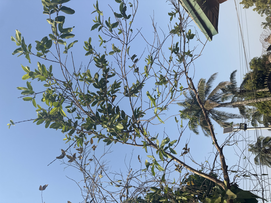 The image, taken in Umuoye, Nigeria, displays an outdoor scene under a clear, cloudless blue sky. A tree with both vibrant green leaves and bare, dry branches with sparse brown leaves dominates the central and left portions of the frame. In the lower background, multiple palm trees with distinctive fronds are visible, alongside other dense green foliage. A utility pole with a solar panel attached near its top stands on the left side of the background. Below the main tree branches, several black utility wires run horizontally. The edge of a building with a dark green, sloped roof and an overhang is visible in the lower right corner, partially obscured by additional green vegetation and a fence line featuring what appears to be razor wire. No people or animals are present, and no explicit actions or interactions are depicted.