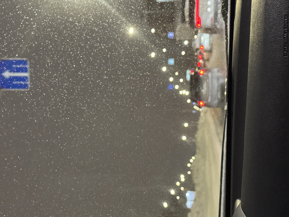 A blurred night scene viewed through a car window with visible snow or raindrops
