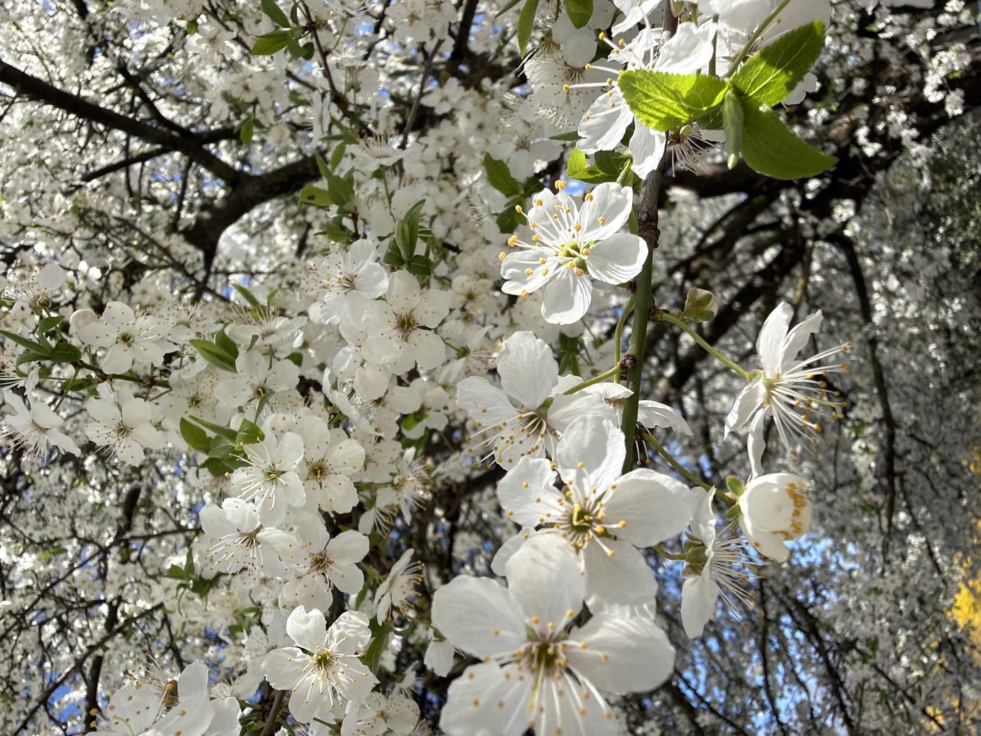 tree in full bloom with white blossoms against a background of branches and a patch of blue sky