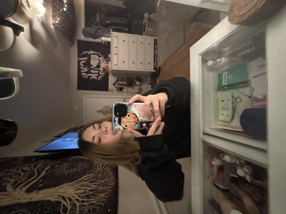 A young woman takes a mirror selfie in a room. The room features a bed with a tree-patterned spread, a wall-mounted TV, and a black and white wall flag. A white dresser and shelves are visible. The mirror reflects a cabinet holding items like scissors and cosmetic products. The phone case features a distinct cartoonish face.