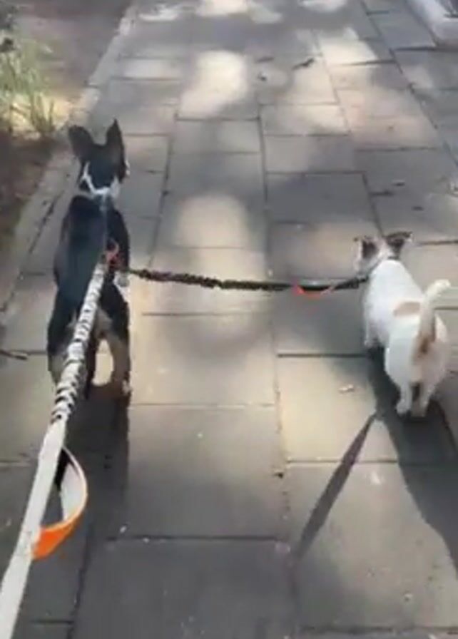 A camera captures a top-down view of two dogs walking on a paved sidewalk. The dog on the left is black and tan with erect ears, while the dog on the right is primarily white with some tan markings and a short tail. Both dogs are leashed together with a braided, black and orange leash attached to their harnesses. The sidewalk consists of square gray paving stones. The camera follows the dogs as they walk, with sunlight casting shadows across the scene. On either side of the sidewalk, there is green vegetation.