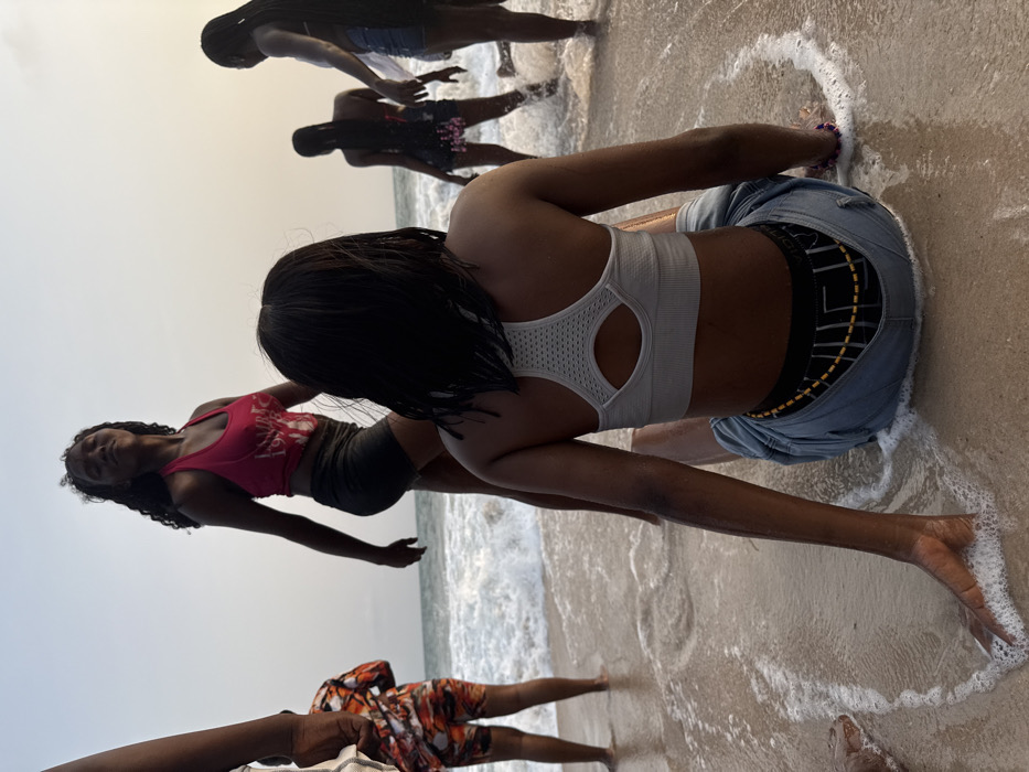 A group of people stand in the shallow water of a beach. The foreground features a woman in a white sports bra and denim shorts, knee-deep in the water. Behind her is another woman in a red tank top and dark shorts. Other individuals stand further back in the water, with the horizon and sky visible in the background. The scene captures a moment of casual interaction and enjoyment by the sea.