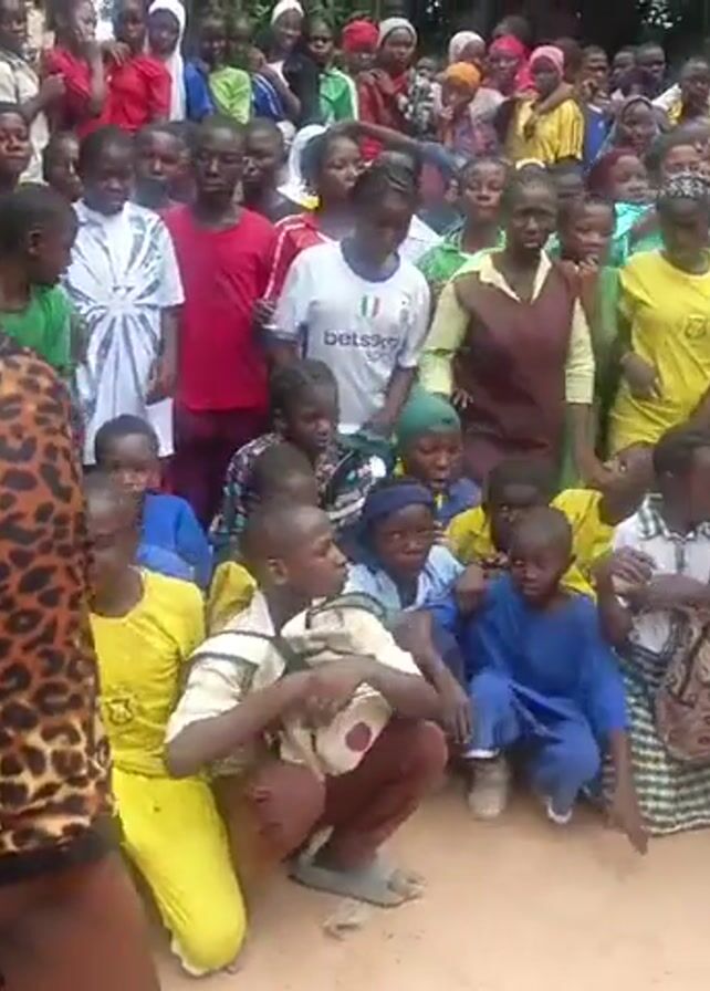 A large group of children are gathered outdoors in what appears to be a school setting. They are dressed in a variety of colorful clothing, including school uniforms in yellow, blue, and brown. Some of the children are sitting on the ground, while others are standing. Two women are visible at the front of the crowd, one wearing a leopard-print top and the other in a long, light-colored dress and a headscarf. The environment includes trees and a dirt ground. The children are looking towards the front, presumably at the women.