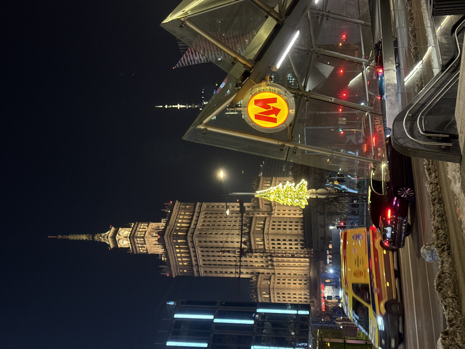Night shot of the Palace of Culture and Science in Warsaw, Poland. A brightly lit Christmas tree stands near the base. A Warsaw Metro entrance, marked with a red "M" on a yellow circle, is in the foreground. A dark car and a yellow van are parked nearby. The sky is dark, and the building is illuminated.