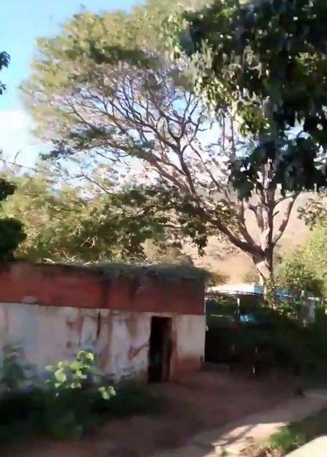 neighborhood scene, possibly taken from a moving vehicle. There's a small, brick building with a doorway, partially obscured by foliage, located on the side of the road. Behind it, a large tree with sparse leaves dominates the skyline, with a mountain visible in the background. Other trees, lush and green, are also present. There is a red and white fence beside a tree with mangoes. The sky is clear and blue. The camera is in motion, suggesting the view is from a car or bus passing by. The lower left corner of the frame displays the text "Infinix SMART8".