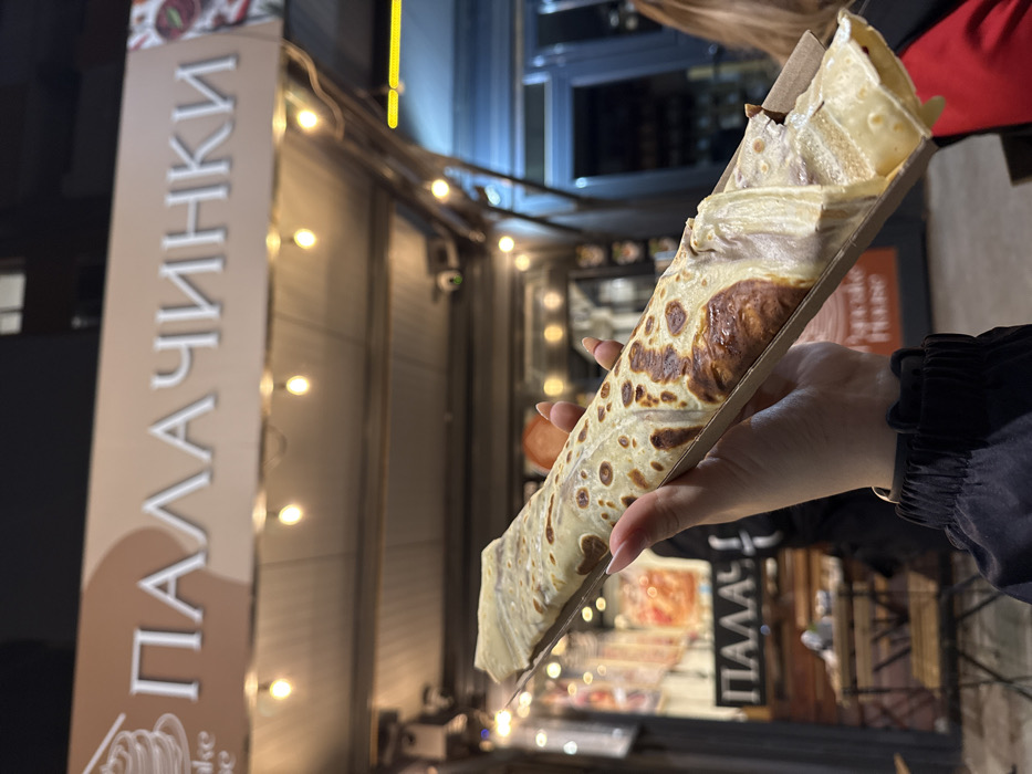 The image depicts a fair-skinned hand holding a large, rolled crepe in a cardboard tray at a nighttime food stall in Sofia, Bulgaria