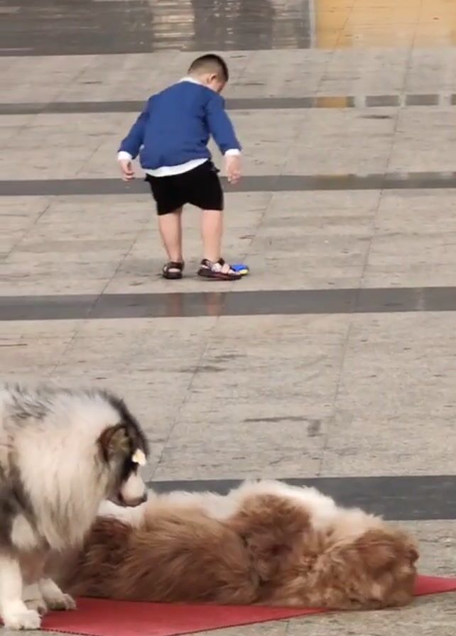 A young boy in a blue shirt and black shorts picks up a blue object and walks away, leaving two large, fluffy dogs in the foreground. One dog is lying on its back on a red mat, while the other stands beside it, looking at the camera. The scene takes place on a tiled surface in an open area. In the background, a group of people is seated on a raised platform near a small yellow building.